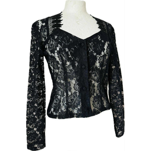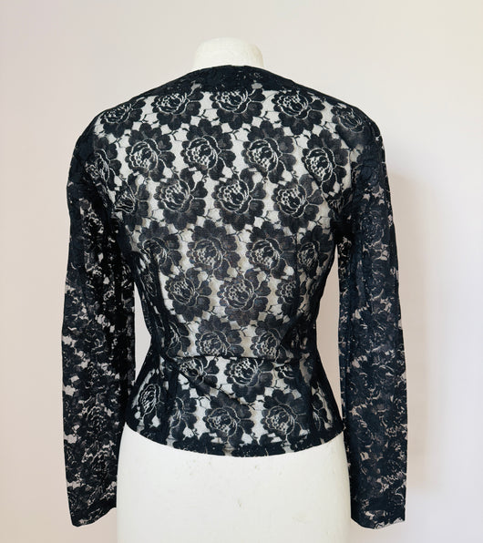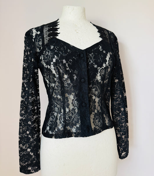 Sultry black polyester lace unlined vintage 1980s New Wave/goth blouse with long tapered sleeves, contrasting lace trim to the shoulders and sweetheart neckline with covered buttons to fasten down the centre front and darts to add shape.