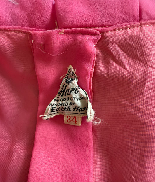 Bodice lined in matching pink fabric, with button fastening to the centre back. Labelled Hart Production designed by Edith Hart, size 34.