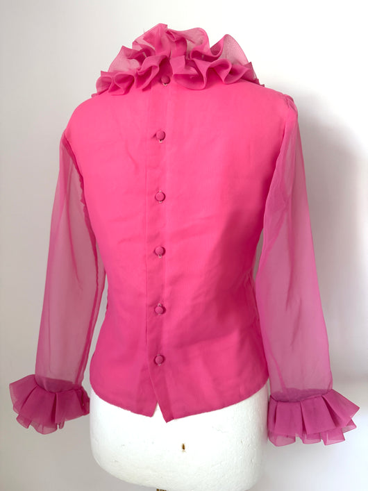 Bubblegum pink chiffon vintage 1960s ruffle neck blouse