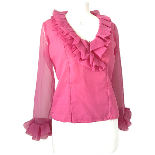 Fabulous vintage 1960s mod blouse in bubblegum pink nylon chiffon, with double layered ruffled neckline, and sheer sleeves with ruffled cuffs.