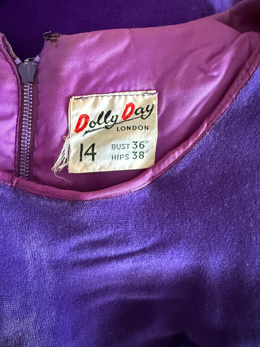 Hammer Horror chic vintage 1960s party dress in divine deep purple cotton velvet. Simple, chic design with empireline bodice, wide neckline, long flared sleeves with white broderie anglaise deep lace trim to the cuffs, and flared skirt. Metal zip to the centre back, labelled 'Dolly Day London'.