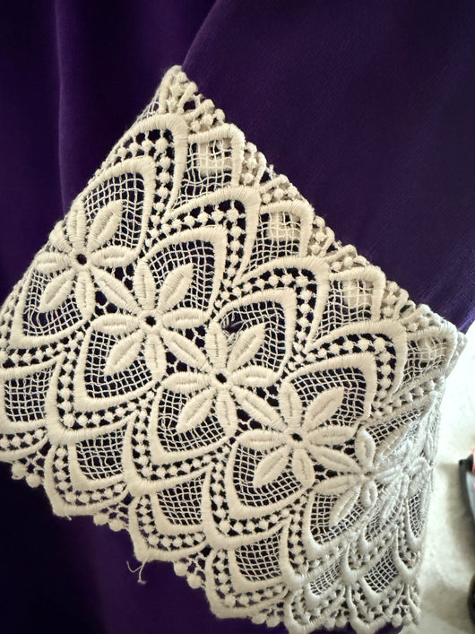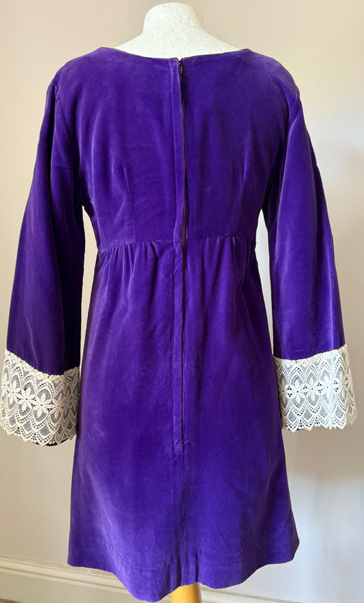 Deep purple cotton velvet vintage 1960s mini dress with lace trim cuffs