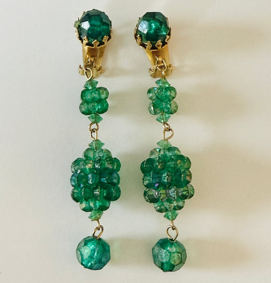 Fabulous, dramatic vintage 1960s beaded drop earrings in emerald green. Plastic beads with a borealis-like shimmer, and goldtone metal hinged clips.