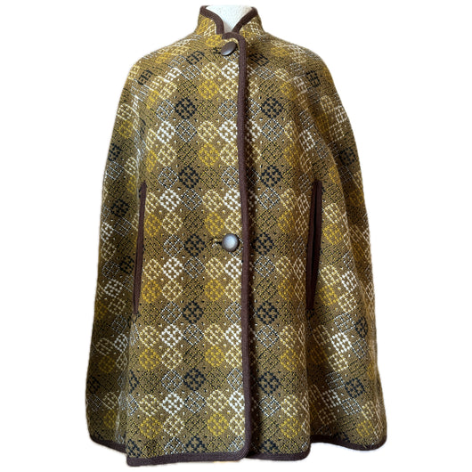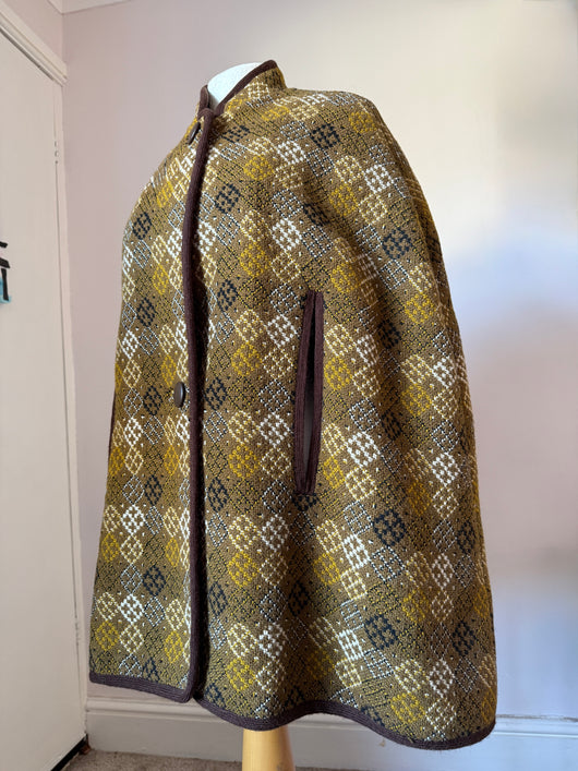 Classic vintage 1970s Welsh wool tapestry cape in mid brown, cream, mustard and black geometric patterned wool. Eastern collar with brown trim and two large brown buttons to fasten. Slits to the front each side for your arms.
