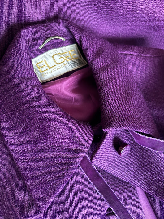Elgee of London plum purple wool 1960s vintage coat with velvet trim and ties